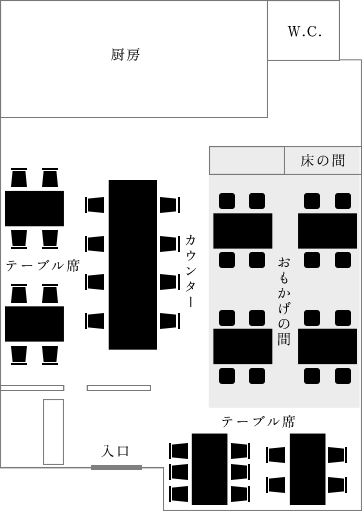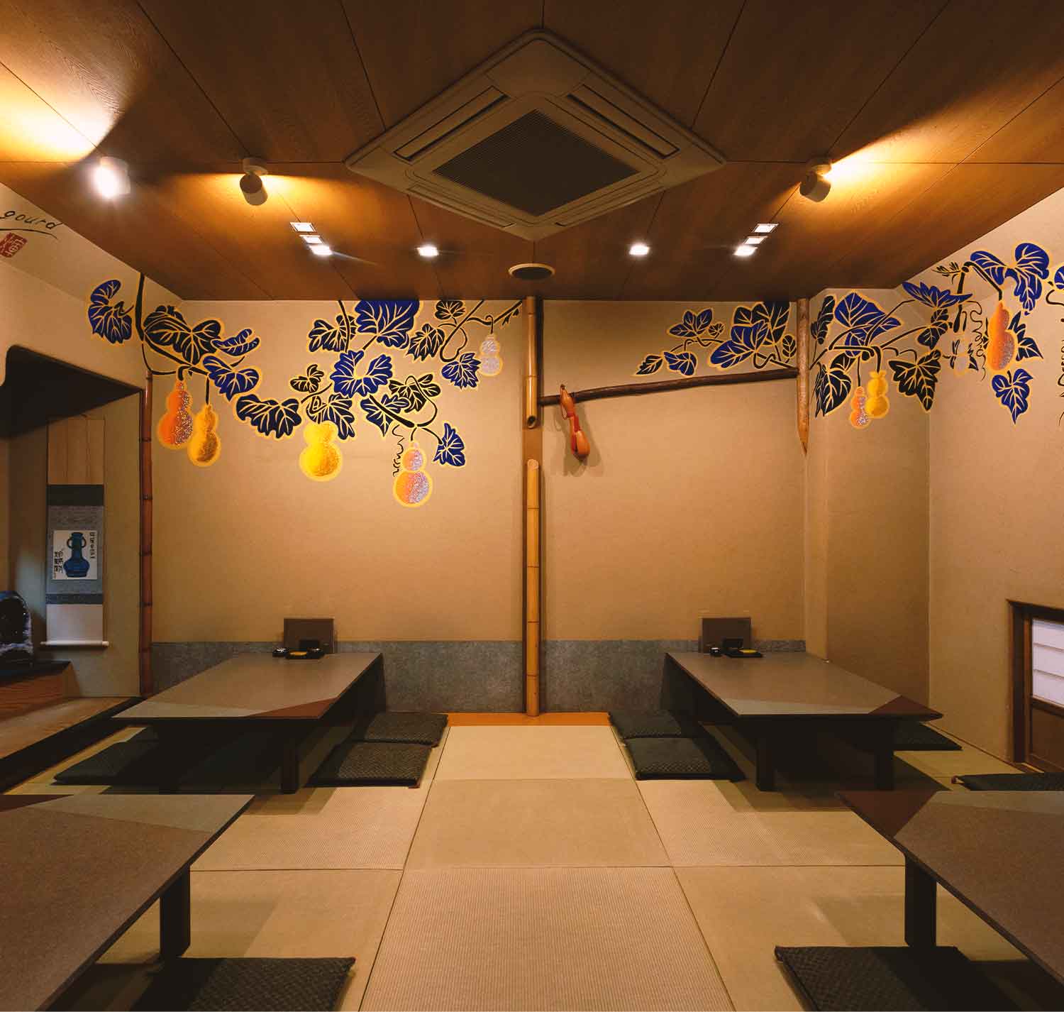 和の雰囲気の温かみある店内には、用途によって使い分けが可能な多様なお席を設けています。1人飲みの場合はカウンター席へ。ご家族など少人数のお食事から大人数でのお集まりにはテーブル席へとご案内いたします。大阪府出身の絵師、木村英輝さん(通称・きーやん)が描いた、ダイナミックなひょうたんの壁画を眺めながらごゆっくりとお過ごしください。
